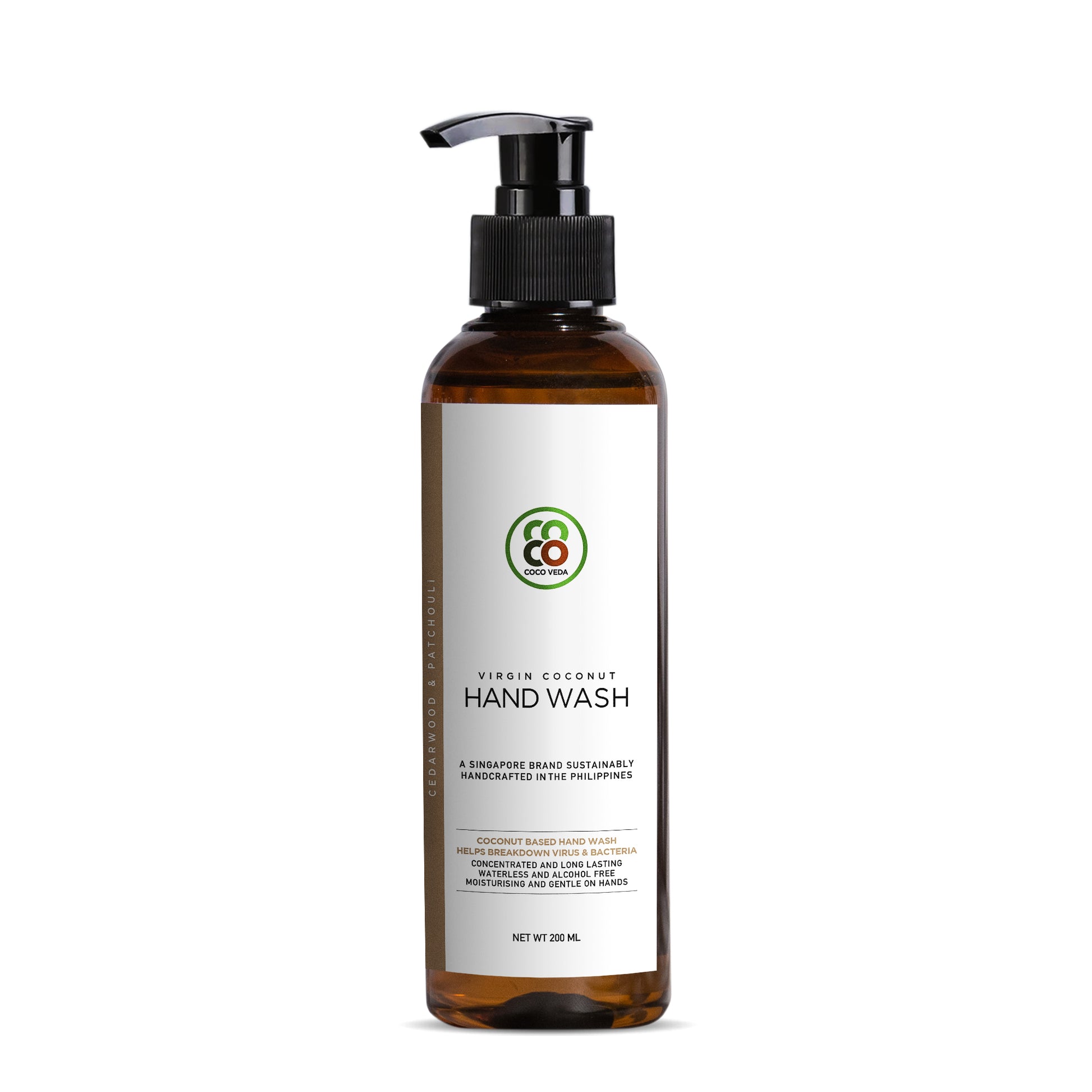 A Coconut Based Waterless, Alcohol Free and Vegan Hand Wash with Essential Oils of Cedarwood and Patchouli for Daily Use.